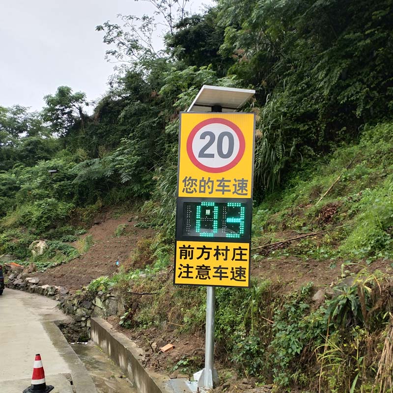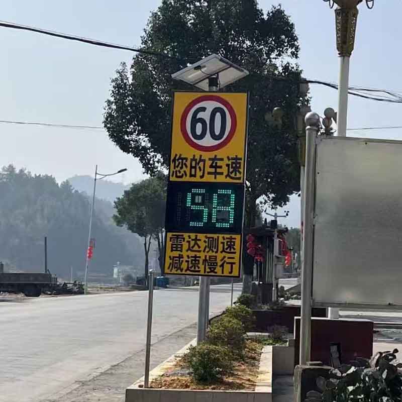 太阳能雷达测速仪:是通过微波雷达来测量路面上车辆行驶的速度,测速原理是多普勒工作原理,雷达测速标志利用微波照射行驶中的车辆,并从返回的微波信号中提取出目标速度信号,再转换成相应的车速值,又要和系统中的限速值进行对比,若测速的速度大于限速值,则以红色字体来显示所检测的速度值,若小于限速值,则以绿色字体来显示检测速度值。